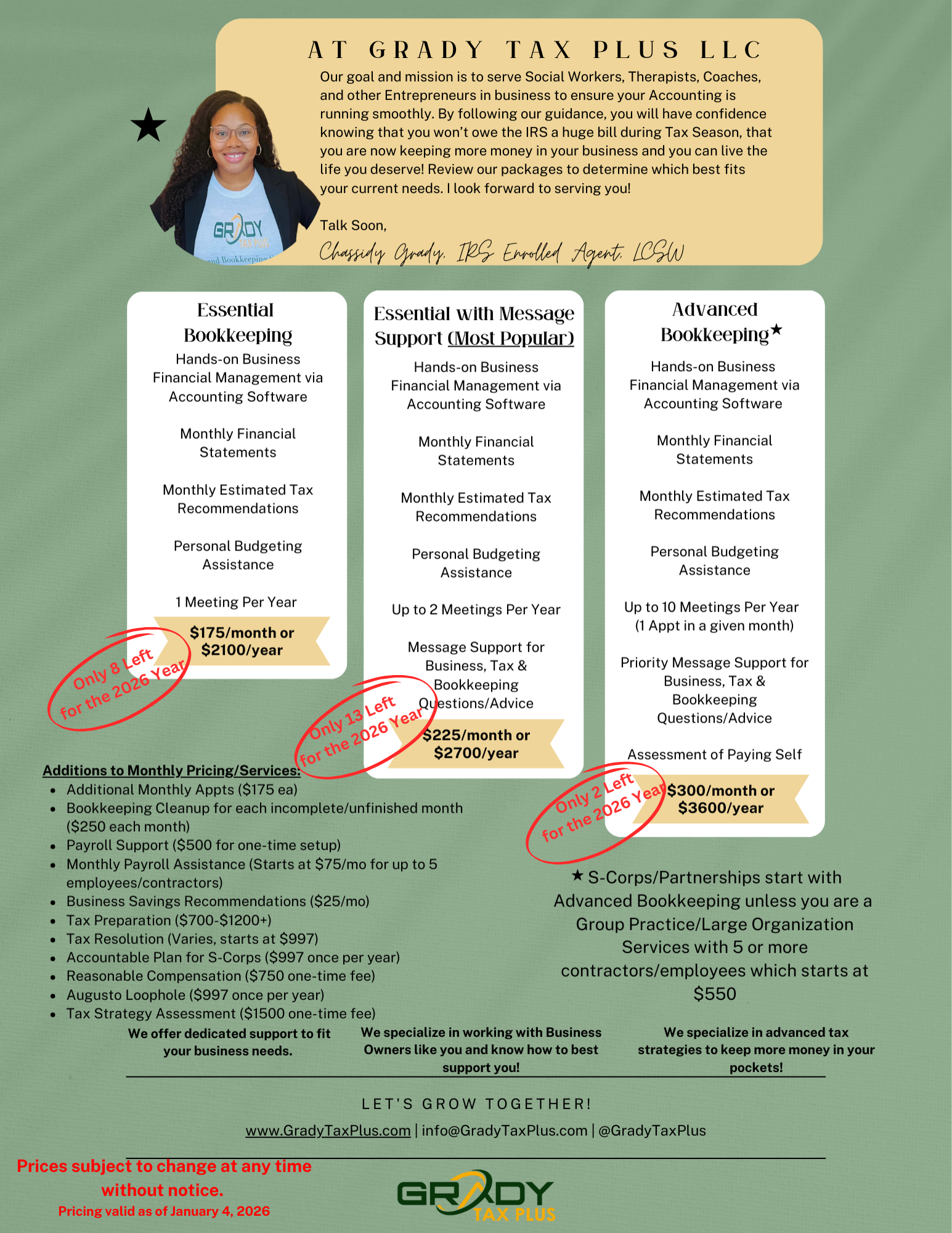 We have Essential and Advanced Bookkeeping options for you to choose from based on your current business needs. You can always upgrade or downgrade if your needs change. Fill out our questionnaire form so that we can gather information from you prior to scheduling your appt. Click the link to get started Today!