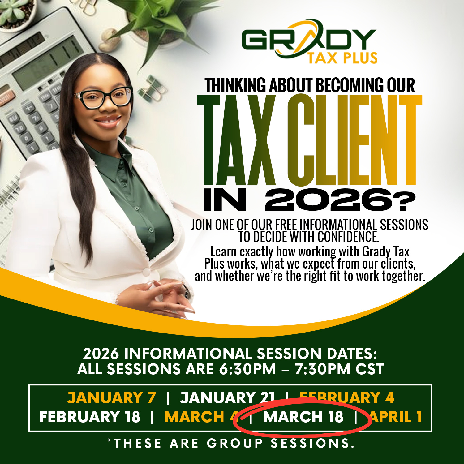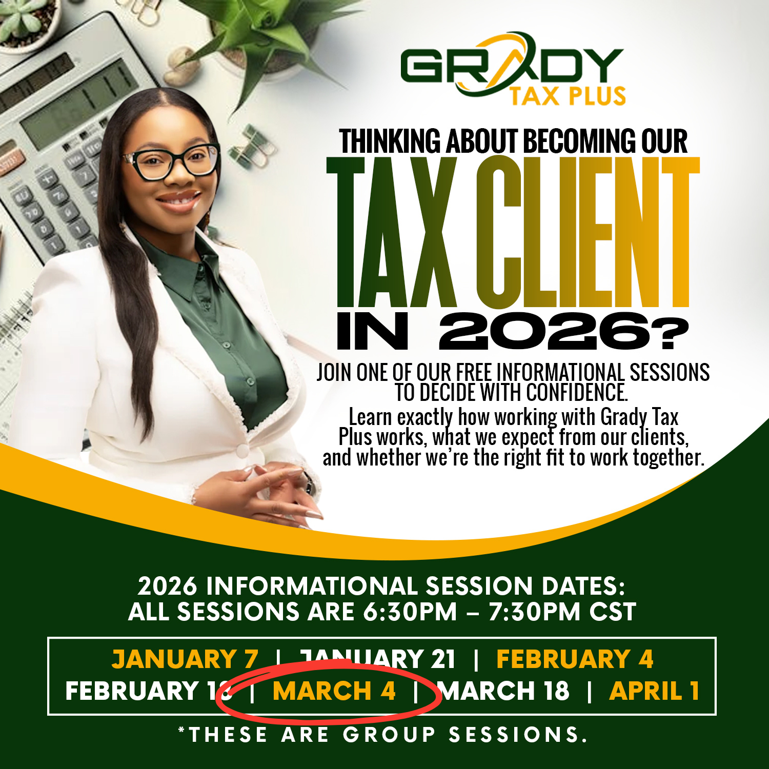 Our Tax Services Informational Sessions are live, group-based Zoom calls designed for individuals and business owners who are considering working with Grady Tax Plus for tax preparation services.