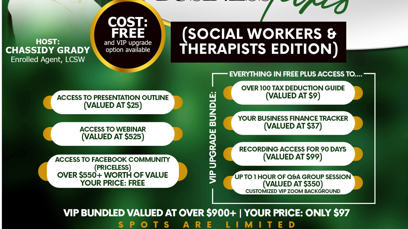 Chassidy Grady is a Licensed Clinical Social Worker and IRS Enrolled Agent with over a decade of experience in mental health. After years of clinical work, Chassidy transitioned into the Tax and Accounting industry to help Social Workers and Therapists be financially successful in business by keeping the IRS out of their pockets. As a two-time business owner, Chassidy understands the financial challenges faced by Social Workers and Therapists in Business. Honored as the 2023 Trailblazer in the Tax Industry, 2023 Bookkeeper of the Year, 2024 Finance Expert of the Year, and 2025 Girl Boss Tax Preparer of the Year, she is committed to empowering mental health professionals with financial clarity and confidence. Through education and consulting, she addresses the critical lack of financial training in the mental health filed. Using a Solution-Focused approach, Chassidy helps Social Workers and Therapists build a positive financial mindset and long-term business success through workshops, tax support services, and personalized guidance.